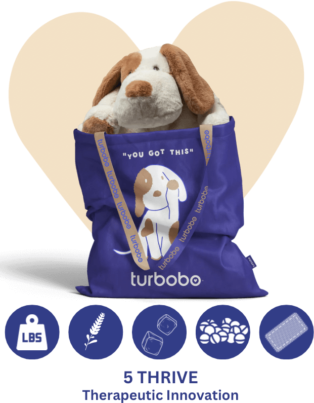 "Meet Turbobo! Created with love. Fueled with 5 Thrive Therapeutic Innovation: Five therapeutic devices in one lovable therapy pup!”