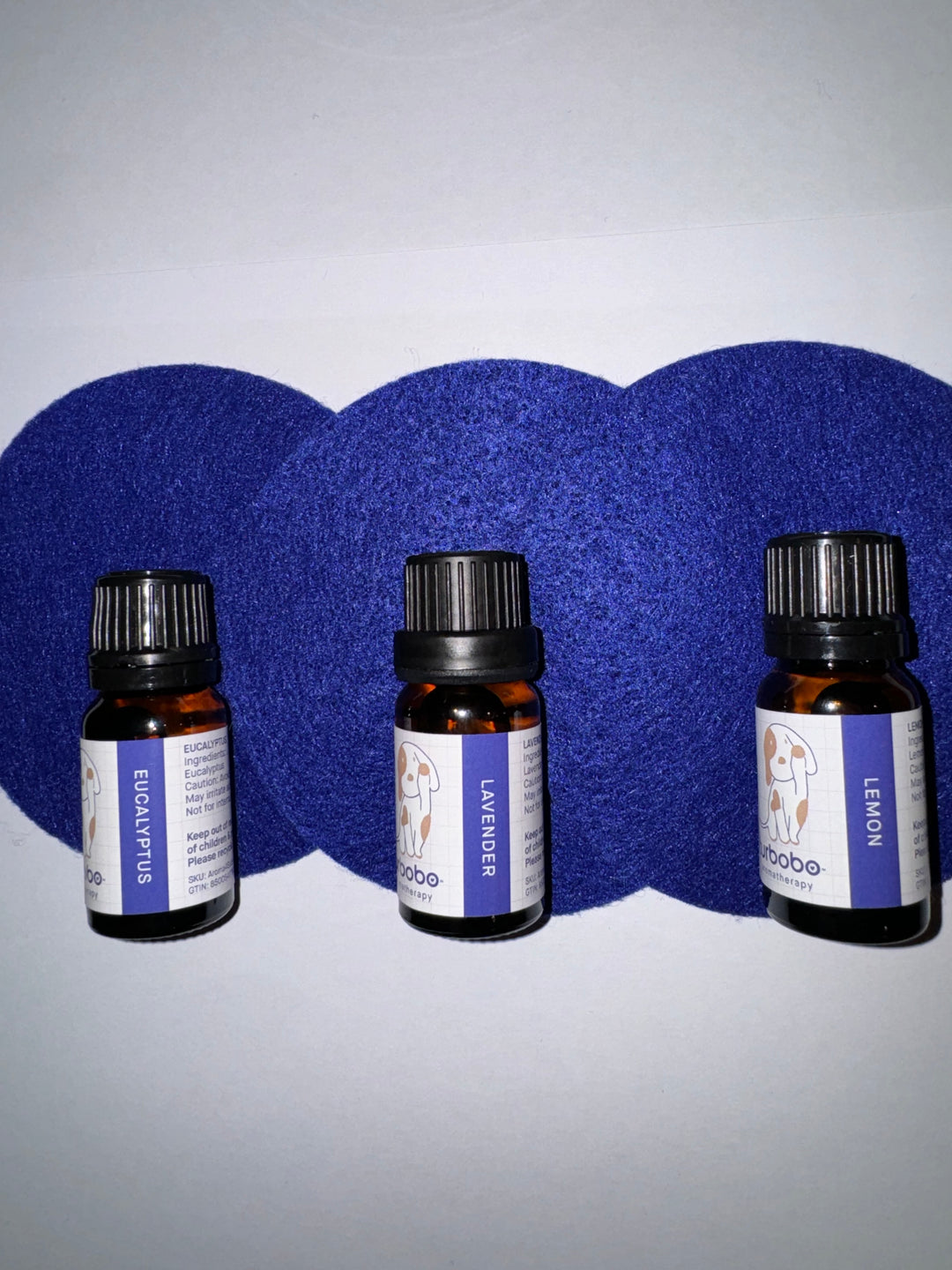 One Turbobo dog, one ice/ heatable gel pack, a bottle of essential oil (Lavender), and a circular felt aroma therapy applicator pad!