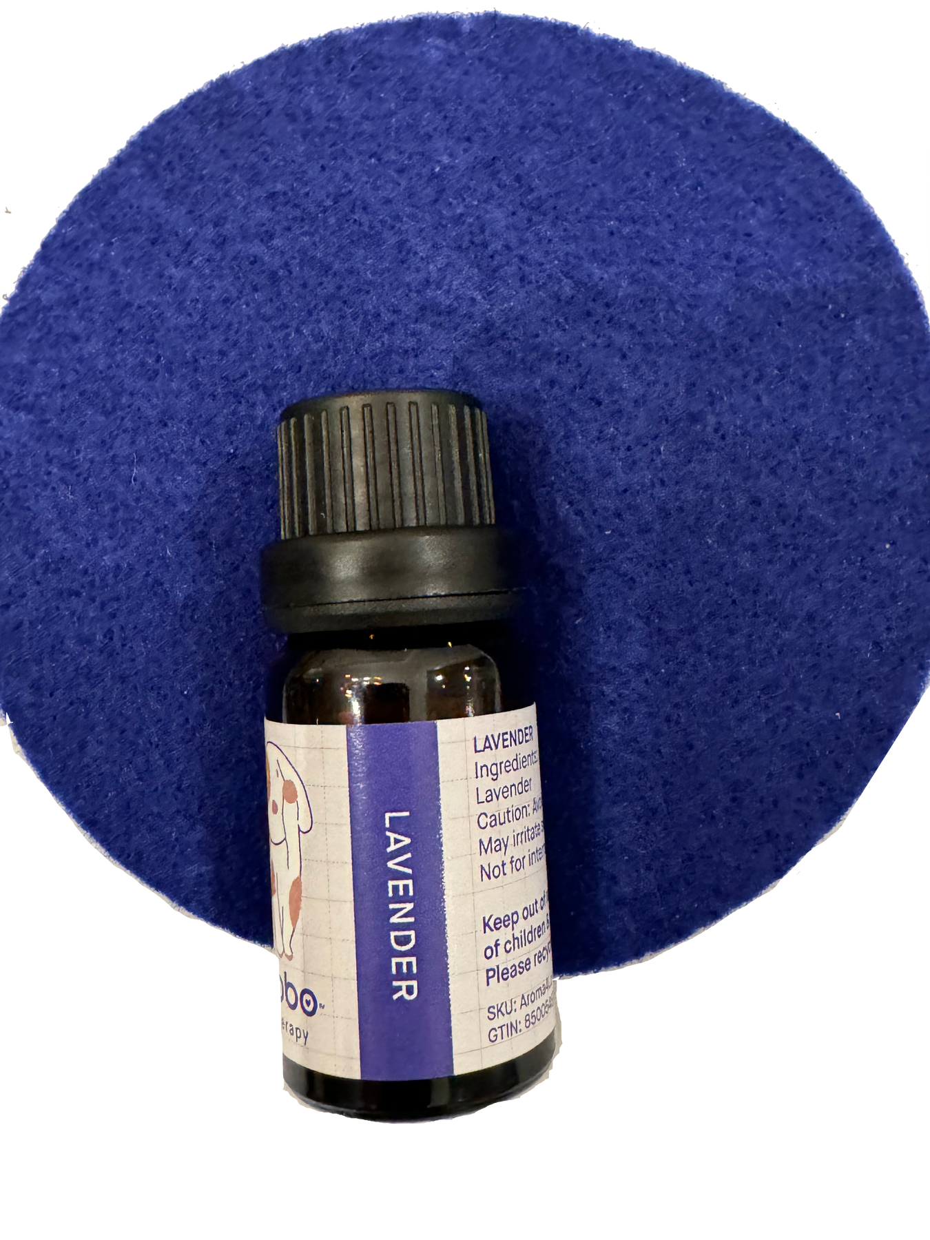 One Turbobo dog, one ice/ heatable gel pack, a bottle of essential oil (Lavender), and a circular felt aroma therapy applicator pad!