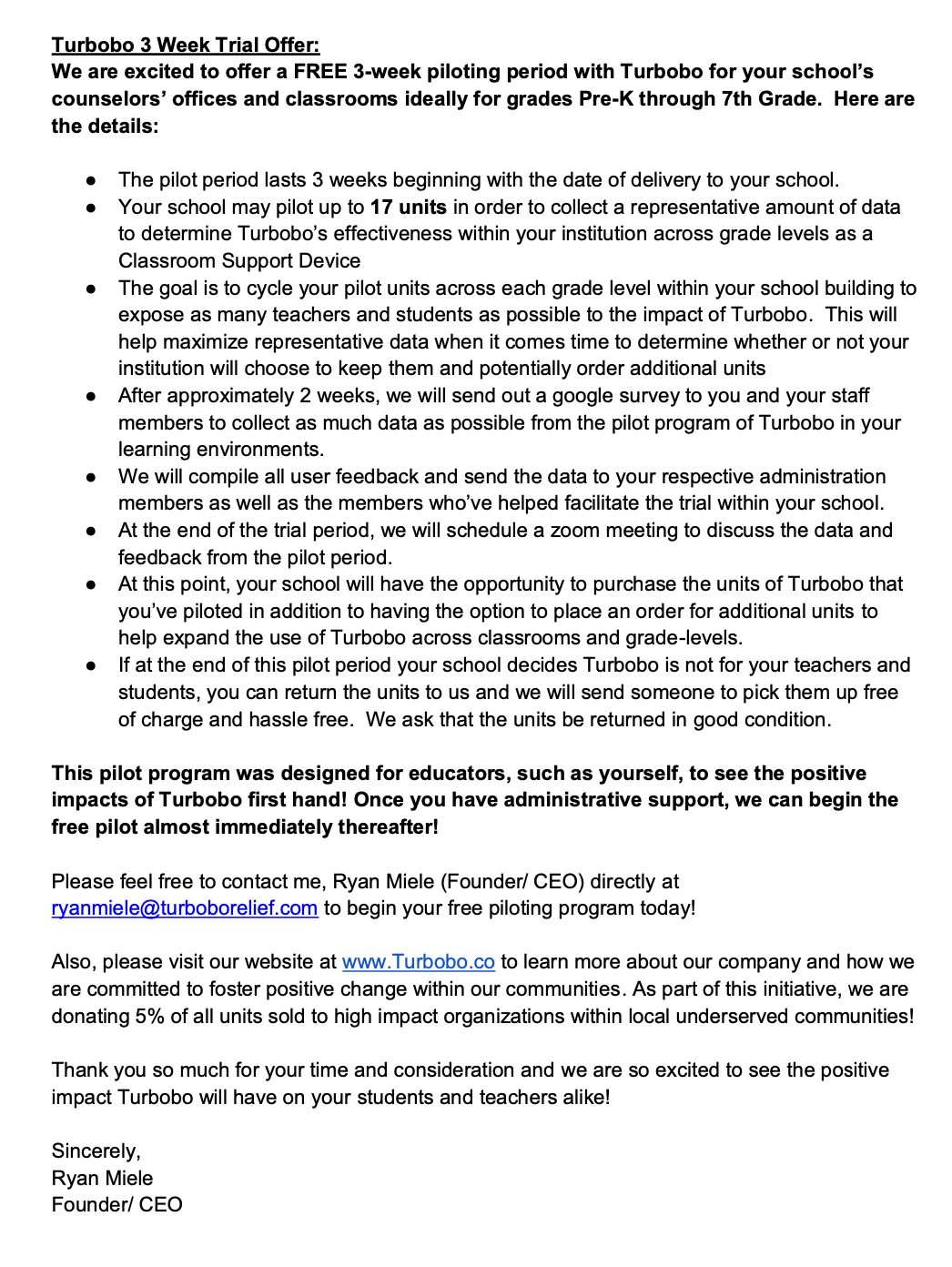 Free Trials For Schools: We offer a 3-week free pilot period for schools (see pilot description) so you and your school can see Turbobo's positive impacts first hand without any initial risk. The purpose of Turbobo is to help teachers and students so we want to make sure Turbobo is a good fit for your school before you make any purchases!