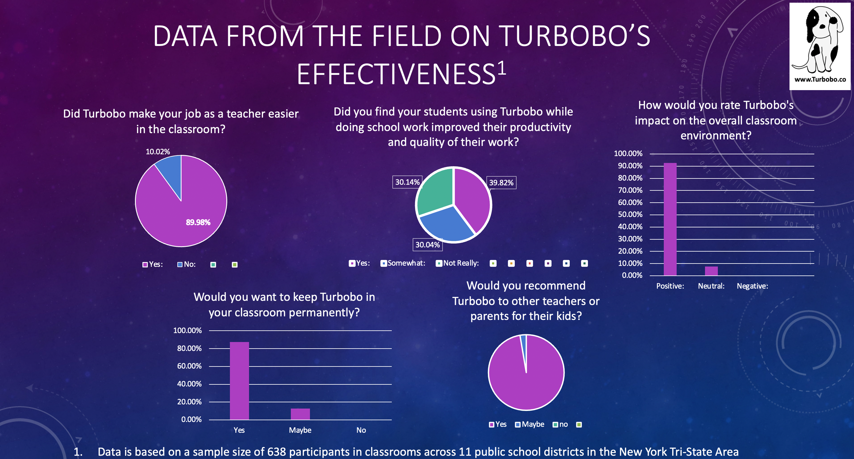 Turbobo is currently utilized in school classrooms and offices across the United States in grades Pre-K through 7th grade as a learning device to improve student experience while increasing performance test scores. Turbobo also offers an SEL (Social Emotional Learning) curriculum available at www.TurboboSEL.com and has proven to be a "game-changer" for countless schools. Please check out the data above from a recent 2024 study proving Turbobo's efficacy as a learning support device!